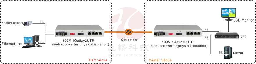 ? 2*100 megabit Ethernet channel, complete physical isolation. The same circuit optical fiber transmission of 2 group network