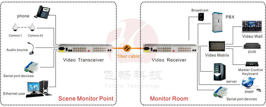 This digital video optical transceiver adopts digital video encoding and gigabit optical fiber transmission technology. The multi-channel single-direction bi-direction audio, video, data, telephone, Ethernet and switch real-time synchronization, no-distortion and high quality transmission is on the single-core or dual-core optical fiber. Complete digital video non-compression transmission technology, with video and data condition indicator, can monitor the system normal operation. It uses modular design, the user can flexibly select or customize configuration based on the scene occasion. Rack installation or desktop installation can be optional. This product is made up of optical transmitter and receiver. It can transmit simultaneously 24Channel forward direction video, audio, data, phone, E1, Ethernet and switch.