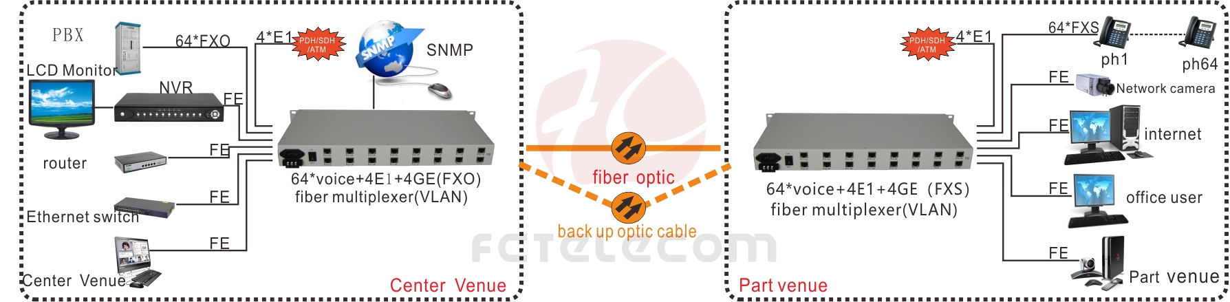 This series of products is developed based on FPGA. This device is 19-inch 1U rack-mounted, providing 64* Voice interface; 4*E1 interface; 4*FE Ethernet interface (Ethernet interface for the switch port, can support VLAN division), and share 100M bandwidth, Can be set through the SNMP port, that is, logic isolation; SNMP management interface and 1 +1 optical port backup; device work is reliable, stable, low power consumption, high integration, Small, easy to install and maintain.