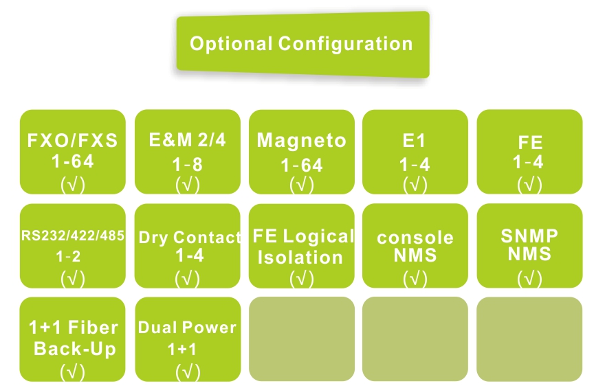 ◆ Voice port to support FXO/FXS/2-4 Wire E&M/2-4 wire Audio/Magnet phone interface, FXO port plug into PBX,  FXS port is connected to the user's telephone;