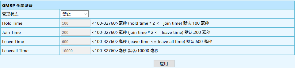 3.如需修改 GMRP 的全局配置,在 GMRP 全局配置框中修改相應(yīng)配置,然后單擊<應(yīng)用>。