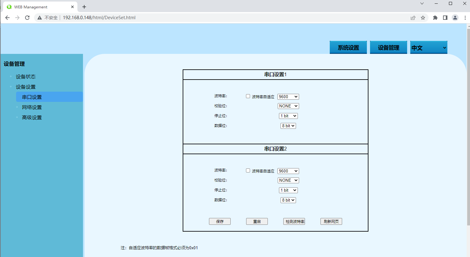 按順序依次打開“設(shè)備管理 > 設(shè)備設(shè)置 > 串口設(shè)置”。在“串口配置”菜單下,可配置串口信息。