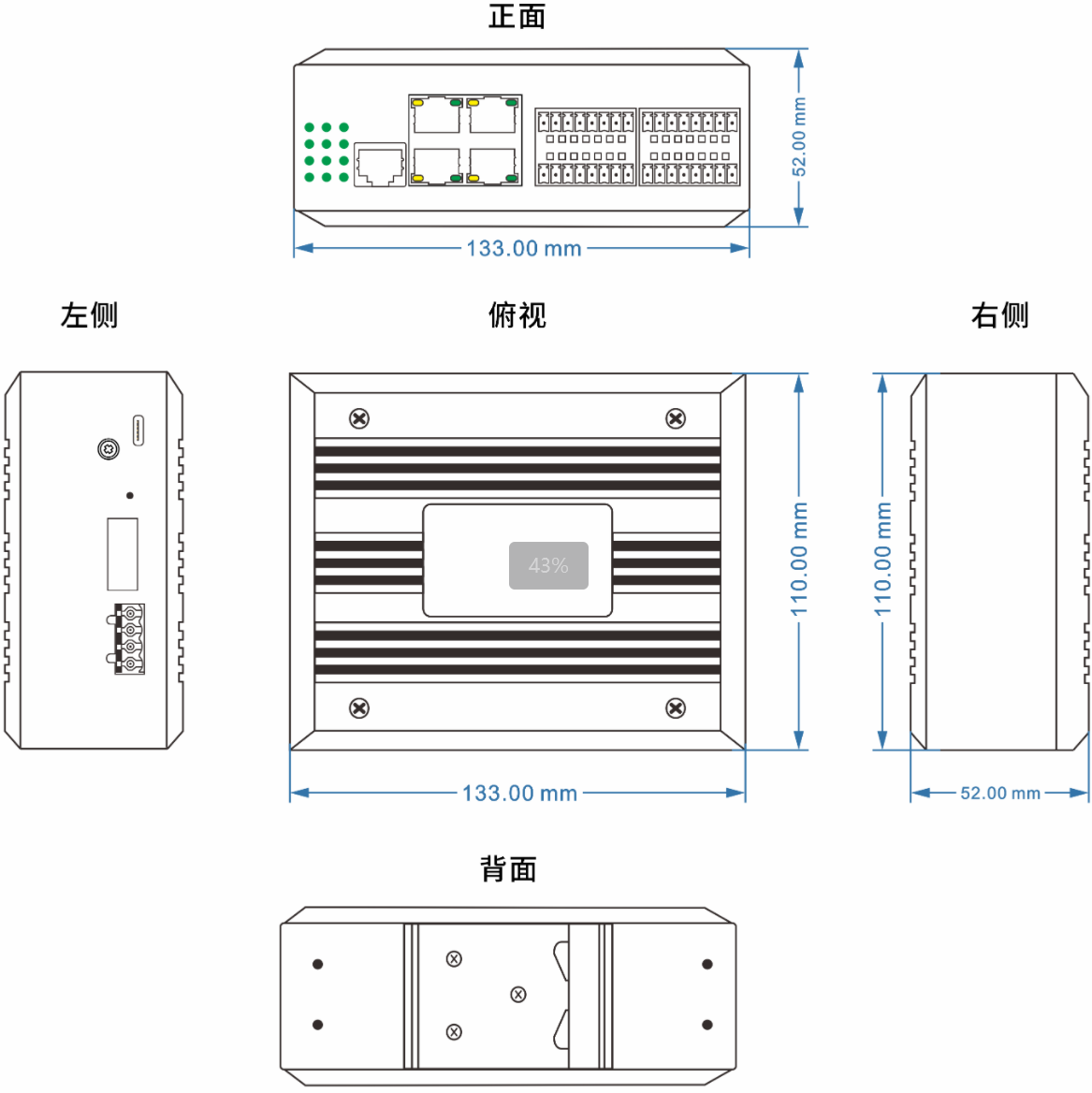 外殼:IP40防護等級,鋁合金材質(zhì) 尺寸:133mm(長) x 110mm(寬) x 52.0mm(高) 裝方式:導軌安裝、壁掛式安裝 |