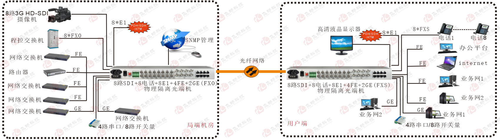 | 業(yè)務(wù)端口描述 | 1-8路3G HD-SDI視頻,1-8路電話接口;1-8路開關(guān)量接口/1-4路RS232-422-485接口,2路千兆以太網(wǎng),4路百兆以太網(wǎng),1個光纖接口1個Console接口,1個SNMP接口 |